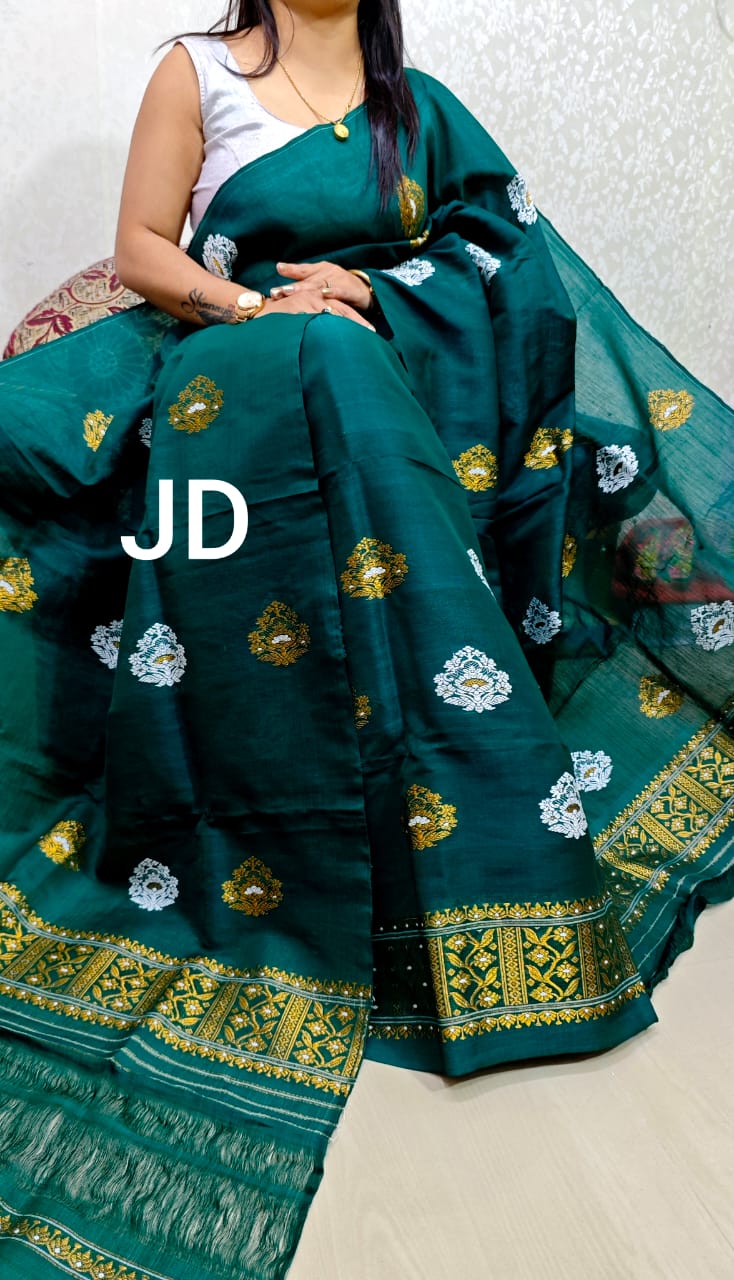 Pure cotton kesa paat mekhela chador (dark green colour) is a traditional Assamese dress made from raw mulberry silk or kesa paat, which is pure silk fibers without added chemicals or treatments. Kesa paat is lightweight, skin-friendly, anti-fungal, and biodegradable. The mulberry silk yarn used to weave kesa paat fabric doesn’t go through the degumming process, which gives the fabric a unique look and feel.