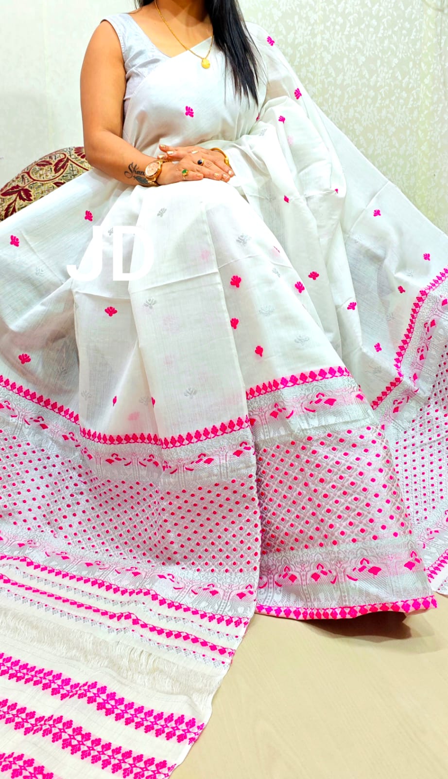 Cotton kesa paat mekhela sador in white with pink and coffee colour
