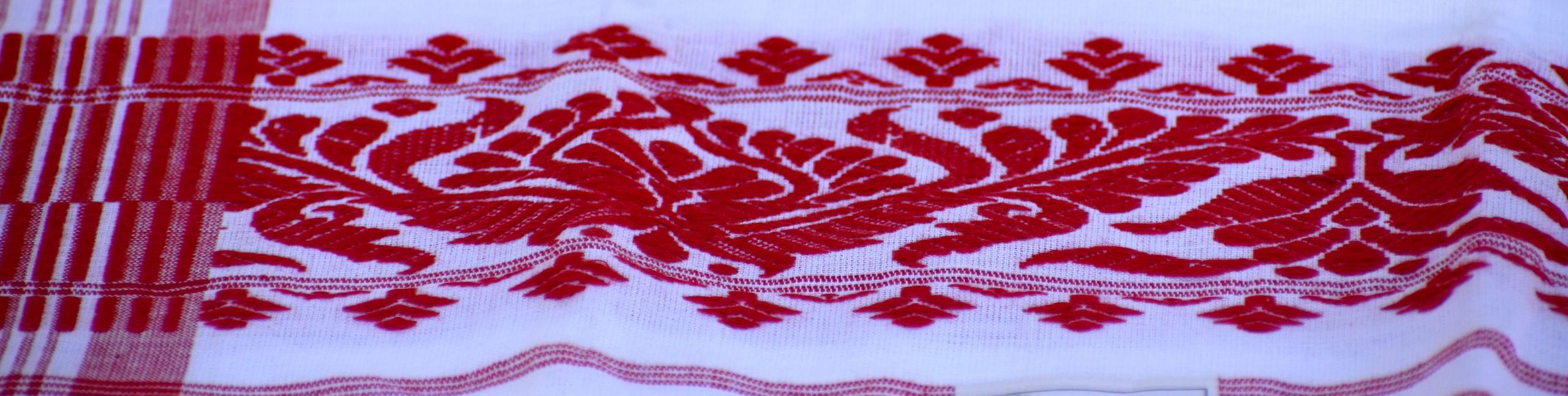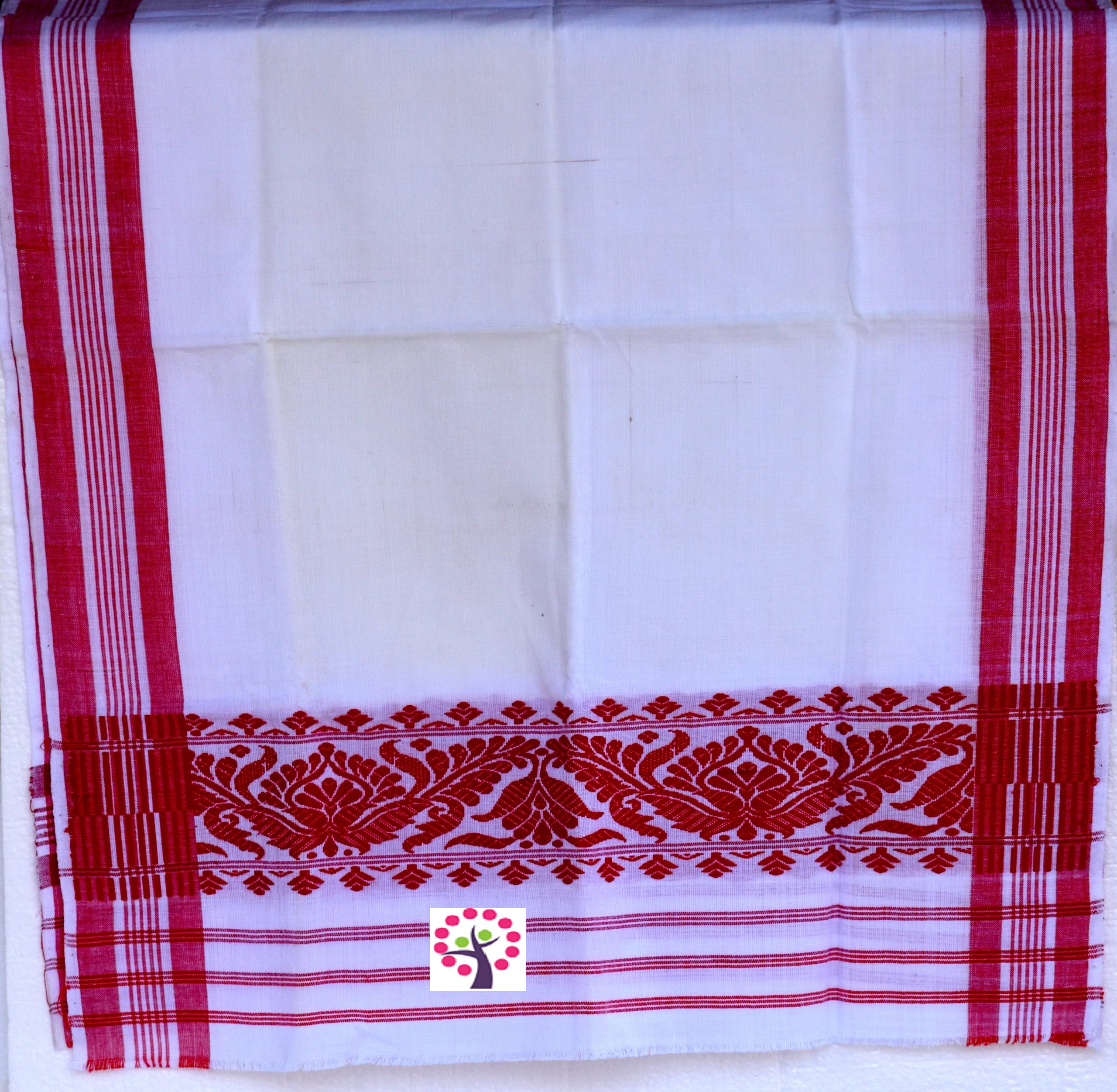 An article of significance for the indigenous people of Assam, Gamosa (Gamusa/Gamucha) is generally a white rectangular piece of cloth with primarily a red border on three sides and red woven motifs on the fourth (in addition to red, other colors are also used). Although cotton yarn is the most common material for making/weaving gamusas, there are special ones made from a variety of other materials. The material used here is Cotton.