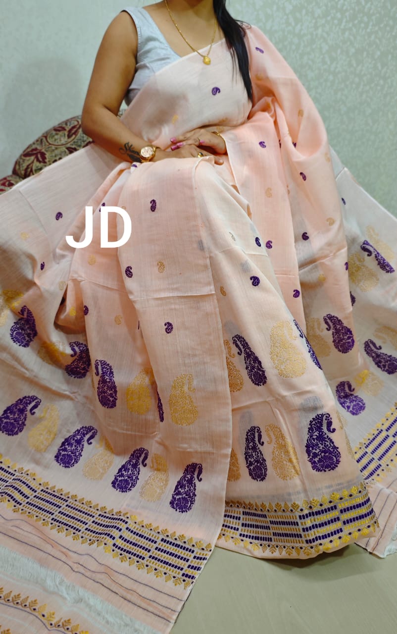 Pure cotton kesa paat mekhela chador (pink colour) is a traditional Assamese dress made from raw mulberry silk or kesa paat, which is pure silk fibers without added chemicals or treatments. Kesa paat is lightweight, skin-friendly, anti-fungal, and biodegradable. The mulberry silk yarn used to weave kesa paat fabric doesn’t go through the degumming process, which gives the fabric a unique look and feel.